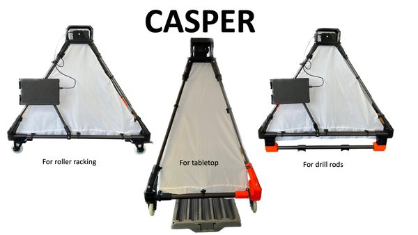 Casper is a revolution in core shed technology. Don't carry your heavy core to your camera. Roll your camera to your core. Casper is an customisable, ergonomic, light weight (less than 7 kilos) unit that can roll over your core in place on your roller racking or work bench.